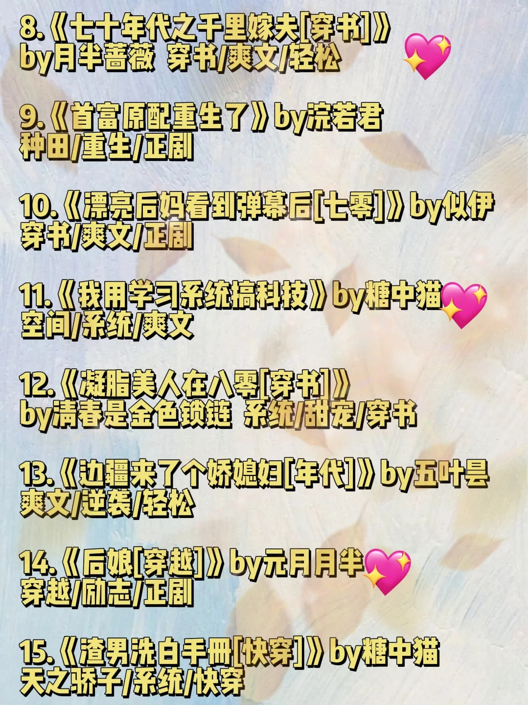 高质量年代文合集推荐第三弹!!! 发布时间:2025-10-12 02:29:06 高质量年代文合集推荐第三弹!!! 《六零年代机修厂》作者:白静年\n《七零随军赶海,岛上来了个大美人》作者:夜昙\n《八零景泰蓝厂花发家史》作者:猫山醉\n《八零通现代,村姑一夜暴富》作者:水木阳光\n《年代文大佬的漂亮作精》作者:糖瓜子\n《挖金矿的丈夫回来了[九零]》作者:恭安\n《七零年代对照组》作者:云纤月\n《大厂时髦亲妈[九零] 》作者:溜溜猪\n《暴发户家的漂亮继女[八零美食]》作者:慕夏衣\n《六零之公派丈夫》作者:浣若君\n#巨好看小说 #年代文 #熬夜必看小说 #完结小说推荐